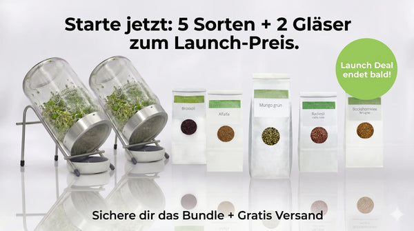 In frischen Sprossen steckt eine gehörige Portion Energie, die ausreicht, damit aus einem kleinen, unscheinbaren Keimling eine starke Pflanze heranwachsen kann. Prall gefüllt mit wertvollen Vitalstoffen, sekundären Pflanzenstoffen und Enzymen, sind Sprossen eine wahre Wohltat für unseren Organismus und sollten auf keinem Speiseplan fehlen. Mit unseren Keimgläsern haben Sie die Möglichkeit, das ganze Jahr über in den Genuss frischer Sprossen zu kommen. Damit Sie gleich mit Ihrer eigenen Aufzucht beginnen können, haben Sie bei uns zudem die Möglichkeit, neben Keimgläsern direkt auch qualitativ hochwertige Samen zu kaufen.