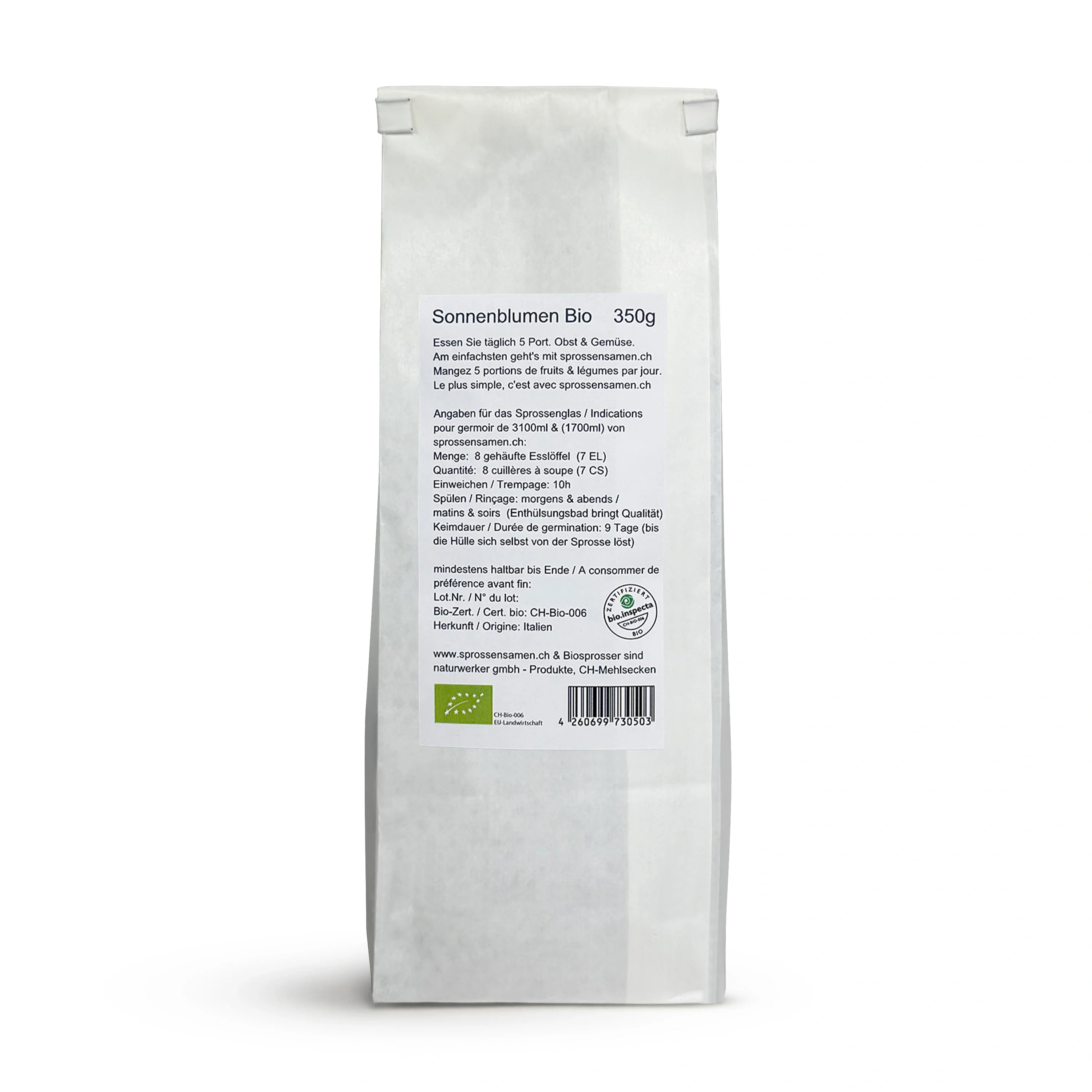 • Keimdauer: als Sprossen 9-10 / als Microgreens 8–12 Tage. Anschließend bis zu 2 Wochen als frische Sprossen haltbar.