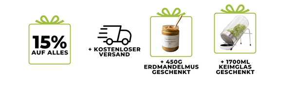 Keine Codes nötig: Der 15%-Rabatt wird automatisch berechnet. Ab einem bestimmten Bestellwert werden deine Geschenke – Erdmandelmus oder Sprossenglas – automatisch in den Warenkorb gelegt.